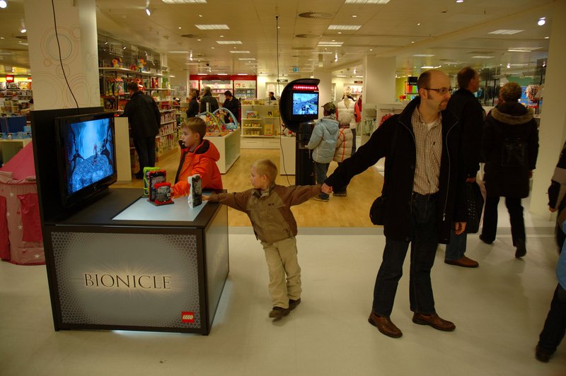The table was tested in a toy department of a local department store for a period of four weeks, and based on a detailed analysis of the ways the table was used on a single day, we identified 94 interactions, ranging from six seconds to twenty-five minutes in length, some interactions overlapping. A total of 124 people were observed interacting with the table, and the distribution of gender and age indicates that a wide variety of people engaged in the interaction, though most were boys under sixteen years of age. The observations clearly show that the table was successful in attracting people to use it, and to explore the characters coming out of the Bionicle box.