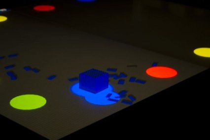 The installation featured two types of tangible objects: Cubes and stylized Buildings. Along the edge of the table, a series of colored circles provided interaction points. When first placed on the table, all tangibles appeared white. Cubes constantly emitted virtual bricks onto the surface. Moving a cube into one of the colored circles, changed the color of the cube, and the bricks it sprayed matched the new hue. When two colored cubes approached each other, they flickered and swapped colors. Bringing a cube near a building applied a layer of bricks in the cube’s color, allowing users to paint buildings with multiple layers. Once a building was fully colored from bottom to top, it triggered a bright flash, scattering surrounding virtual bricks in an explosive effect - see video below.