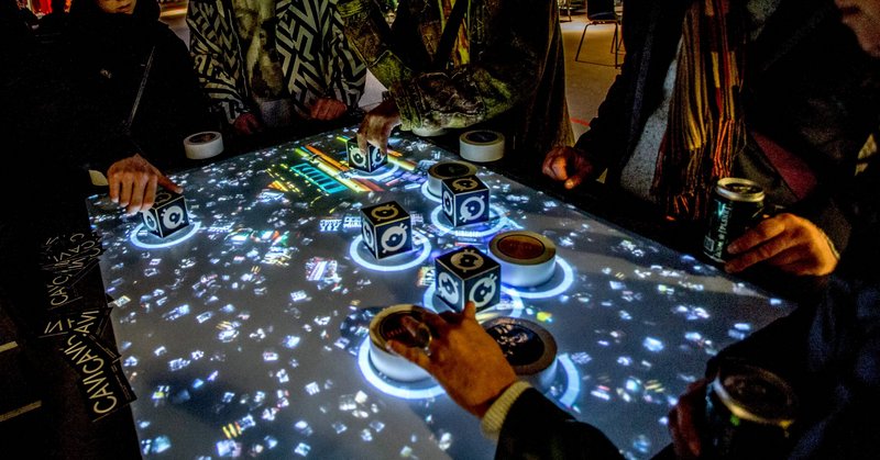 The participants have two types of physical blocks at their disposal: cubes and flat cylinders. When a cube is placed on the table, a music loop is played that is linked to the specific tag (graphical pattern) placed face down on the table. Turning the cube clockwise, turns up the volume, and vice versa. The musical content is created so that all the music loops match each other and generate a consistent musical output. The flat cylinders represent sound effects. Placing a cylinder in close vicinity to a cube, the sound effect is applied to the music loop linked to this cube. Several cubes and cylinders can be placed on the table at once, creating a rich musical soundscape.