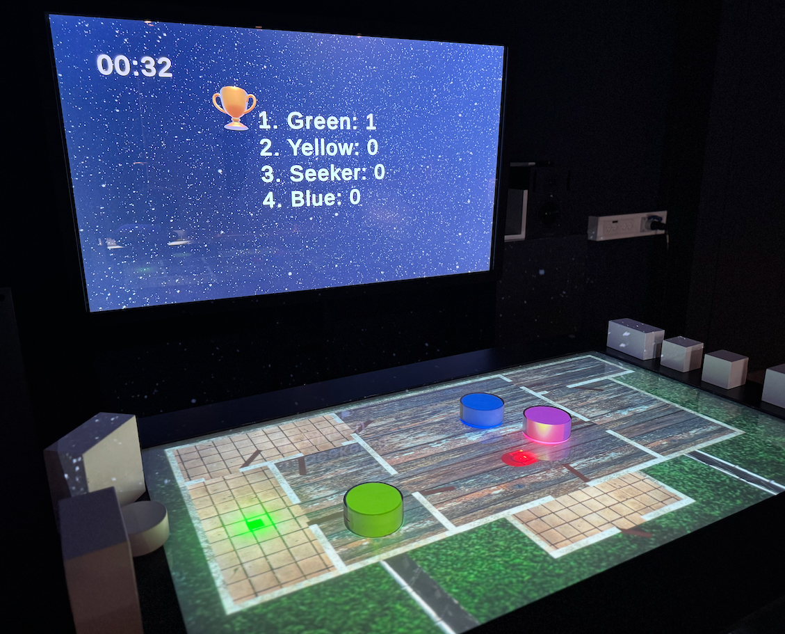 In this game, the students have worked with the research question: How can game balancing mechanisms be used to create fair and engaging competitive gameplay for players in asymmetric roles involving VR and 3D projection tables?